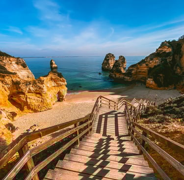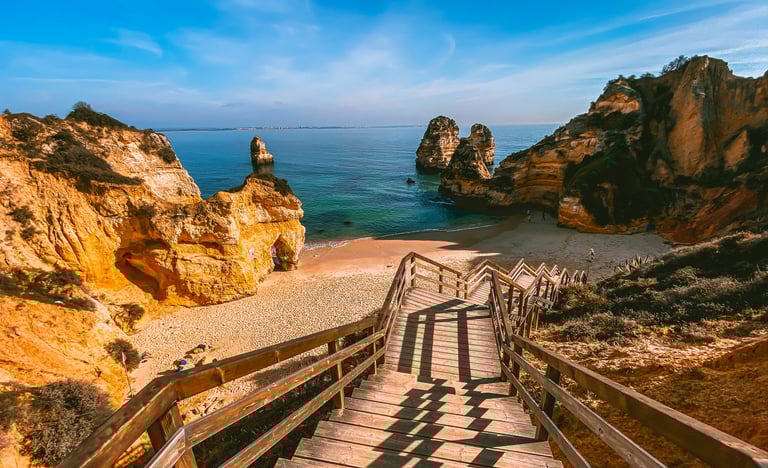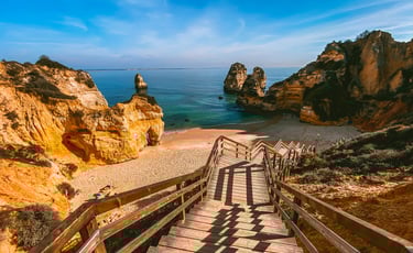 Grâce à son cadre spectaculaire et ses eaux turquoises, Praia da Marinha est l'une des plages les plus célèbres de l'Algarve, située au sud du Portugal. Elle est sablonneuse et possède une côte rocheuse avec de nombreuses falaises. Ces formations comprennent une double arche marine : l'Accroc Naturais, qui se trouve sur la côte ouest de la plage. C'est une destination populaire pour les surfeurs mais également idéale pour la plongée avec tuba et la natation. Il y a de nombreux restaurants, bars et cafés à proximité, le bonheur pour les familles. La période la plus favorable pour visiter l'algarve est d'avril à octobre avec un pic de chaleur juillet et août.
