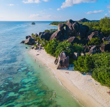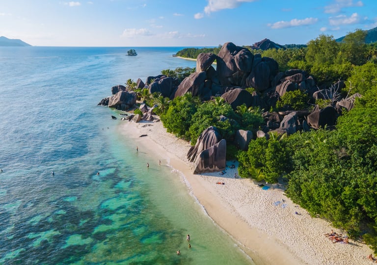 Anse d'Argent est l'une des plus belles plages des Seychelles. Elle est située sur la petite île de Praslin et est entourée d'une eau cristalline. Le sable blanc et l'eau claire font de cette plage un endroit parfait pour nager, faire de la plongée avec tuba ou de la plongée sous-marine.
