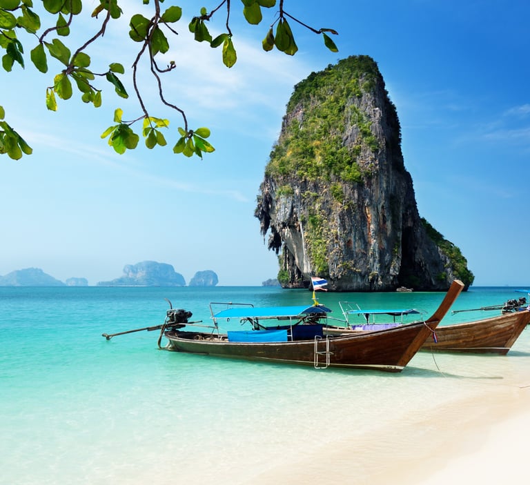 Railay Beach est une plage située sur la côte ouest de Ko Phi Phi Don, une île de la province de Krabi, en Thaïlande. La plage de Railay est réputée pour ses superbes falaises de calcaire et ses eaux émeraude. Très populaire auprès des amateurs de snorkeling et de plongée, c'est là que vous pourrez trouver les plus beaux coraux et les meilleures plages de rêve de Thaïlande ne sont que quelques-uns de ces points forts. Cela fait de Railay l'un des plus beaux endroits de la mer d'Andaman. La plage n'est accessible que par bateau depuis la station balnéaire d’Ao Nang ou de la ville de Krabi. Les bateaux longtail typiques démarrent régulièrement pendant la journée dès que le bateau est plein. Le trajet dure environ 15 minutes et coûte environ 100 bahts par personne. L'île est également très réputée pour l'escalade, le kayak, la randonnée et bien sûr la natation. La péninsule compte 4 plages au total, toutes reliées par des sentiers pédestres. Des vacances inoubliables et uniques vous attendent pour des vacances sur Railay Beach. Même s'il fait chaud toute l'année, la meilleure période pour aller à Krabi est de novembre à mars.